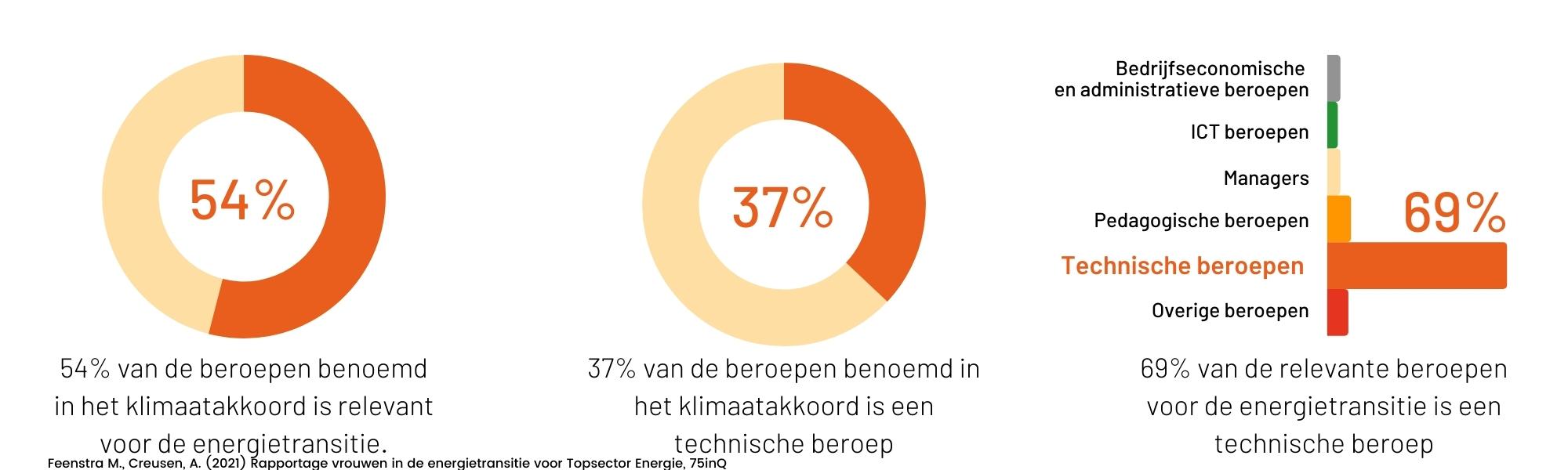 Bij de totstandkoming van het Klimaatakkoord hebben 150 partijen samengewerkt binnen vijf klimaattafels (Elektriciteit, Industrie, Gebouwde Omgeving, Landbouw en Landgebruik en Mobiliteit). Binnen de door de klimaattafels geïndentificeerde beroepen (141), kunnen (76) geïdentificeerd worden als beroepen die bijdragen aan de energietransitie (zie bijlage 1). Hiervan kunnen 69% van deze beroepen aangemerkt worden als een technisch beroep (bijlage 1). Een eerste start in het verkrijgen van meer inzicht in vrouwen in beroepen die bijdragen aan klimaat verbetering en energietransitie. Inzage is te verkrijgen door een uitvraag bij CBS om de beroepen van de klimaattafels te splitsen naar geslacht, functieniveau en energie-beroepen. Zolang deze uitvraag nog niet is gedaan, zijn wij afhankelijk van reeds beschikbare cijfers.