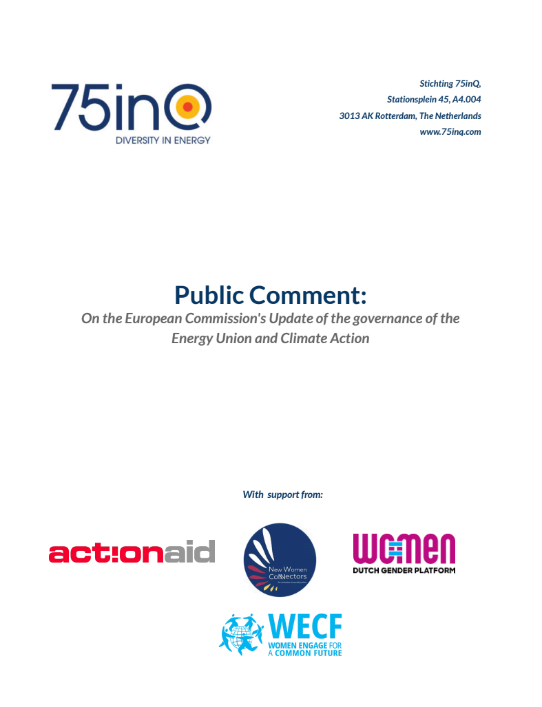 Request by the EU to get input on reviewing the governance framework of the Energy Union to ensure Member States can effectively meet their National Energy and Climate Plans (NECPs). 75inQ has suggested that the current governance framework overlooks the distributional impacts of the energy transition on women, who are disproportionately affected by energy poverty and shifts in the energy job market. 75inQ recommends that the EU operationalise gender-mainstreaming by making the collection and reporting of gender-disaggregated data mandatory for energy poverty and employment. Additionally, 75inQ advocates for including clear definitions of gendered energy inequality in legal recitals and ensuring that civil society involvement includes representative samples of populations experiencing energy poverty.